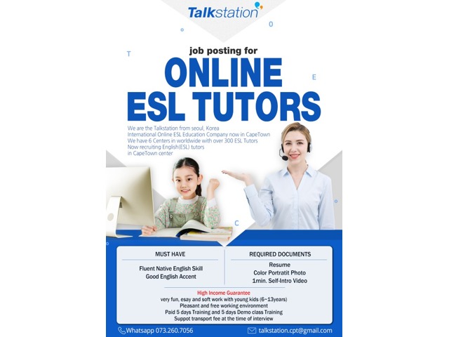 Talkstation is an international company headquartered in Seoul, Korea. It has 8 operation centers around the world with over 300 ESL Tutors, and over 5000 enrolled students, is now recruiting centre based ESL(English) Tutors to work with us in a Cape Town center (Pinelands).