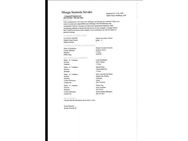 I am menga sevake am looking for cleaning position and Caregive and security retail