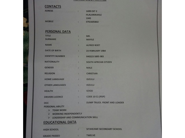 My Name Alfred mayile am looking for a job as a driver or general work in your company and I have code 10 prdp licence