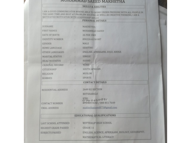 I'm looking for a security job,an my positive points are that I have qualifications and experience on the fild an I'm a dedicated person when it comes to my job,and a hard working person I work underpresure an I can work as a team,I blv I'm the right person for thise job of security if there is any vacancy.