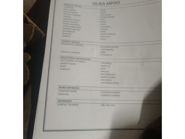 Am here by looking for general worker, miner. Artisan assistance, internship or Learnership. As am desperate for a job so that I can fulfill my basic needs for my family. Soo am just feeling loneliness because I only left with my mom and she had a problem with there legs so she can't work for herself. That's why I choose to market while am so young. Thanks for your sampathy. As it cloud be wonderful to here from you. God bless you.