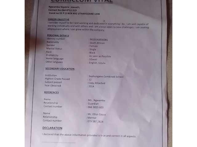 I'm ngwamba Ncobile, I'm kindness , friendly and hamble. I'm looking job because l want to support my family.