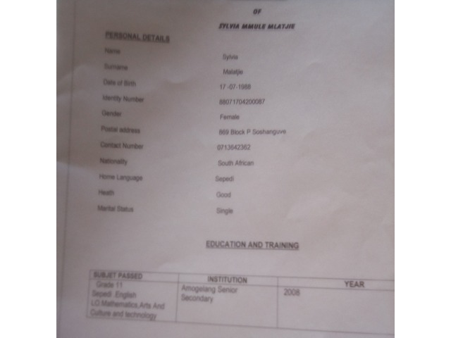 Good day I'm Sylvia from soshanguve ,I'm looking for a job ,a general worker so that I will provide my family and I'm staying with my child and my mom is not working ,that's why I'm asking for a job.could u please help me with this job I need it with all my heart .
