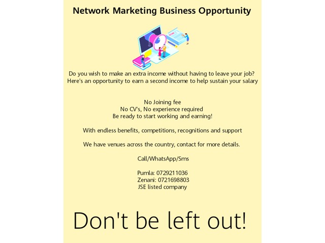 This is a network marketing business that gives you the opportunity to earn an extra income without having to leave your job. Work at your own pace, no Joining fee required. We have venues across the country.