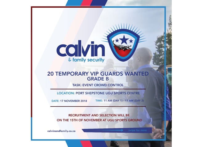 Calvin and family security services are looking to employ 82 grade C Gaurd’s and 20 grade B VIP body guards for a one day event at the ugu sports ground on the 17 of November